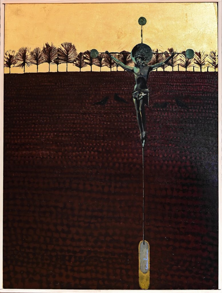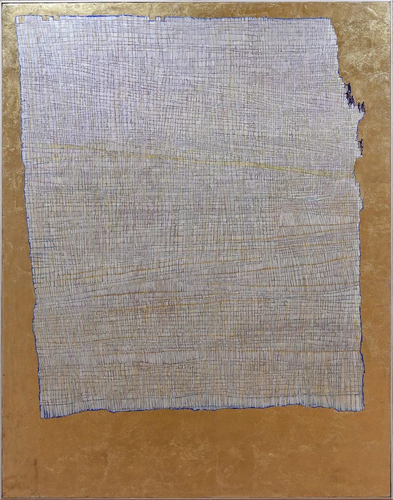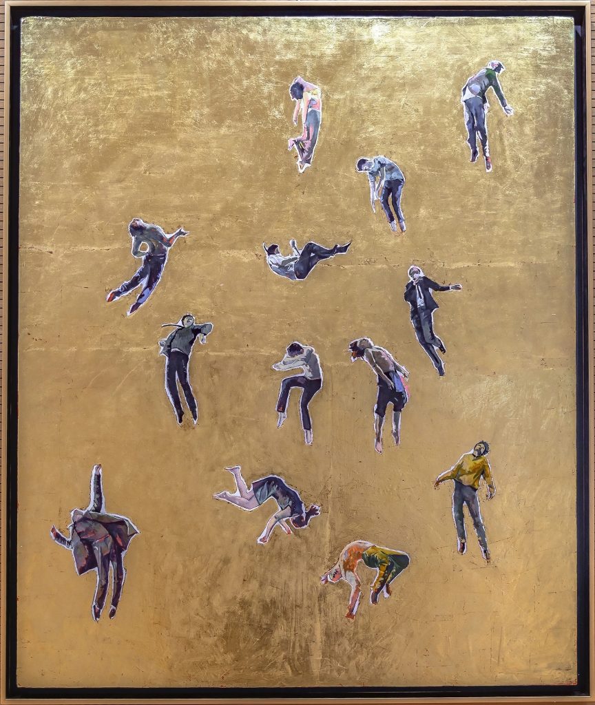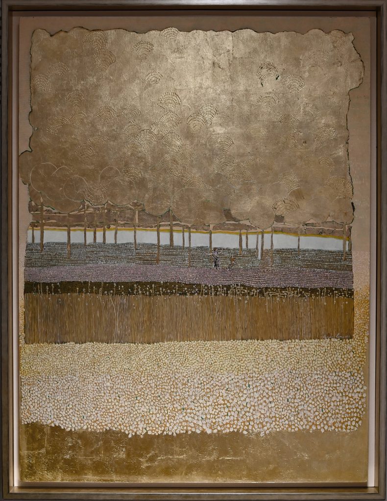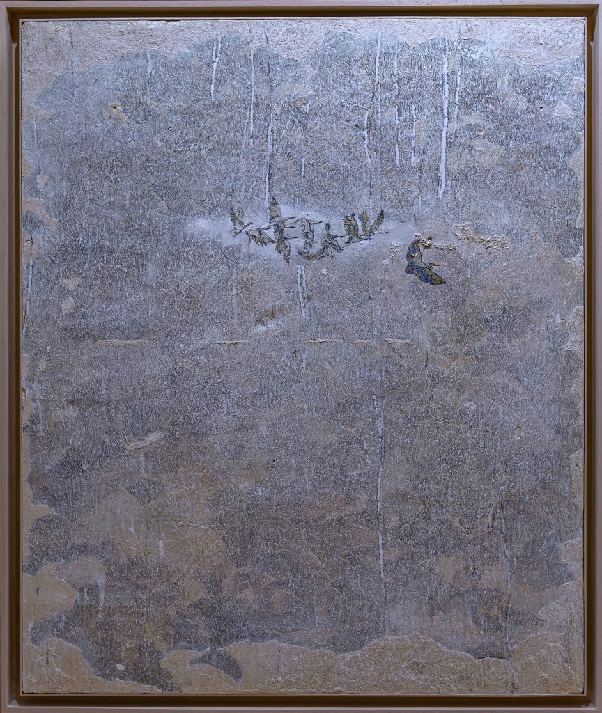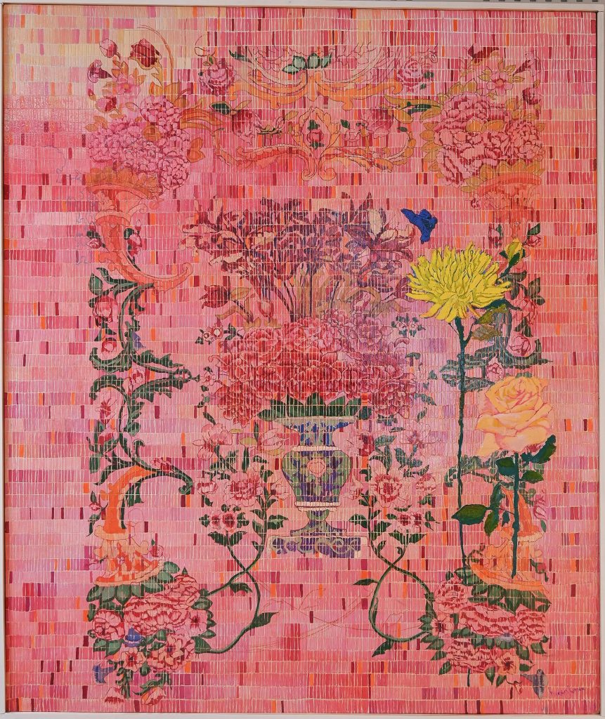 Gravure, perles de verre, dentelle, feuilles de cuivre et peinture à huile