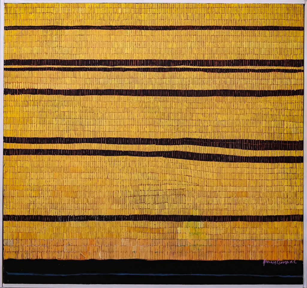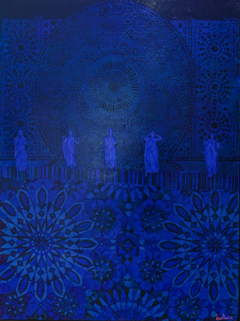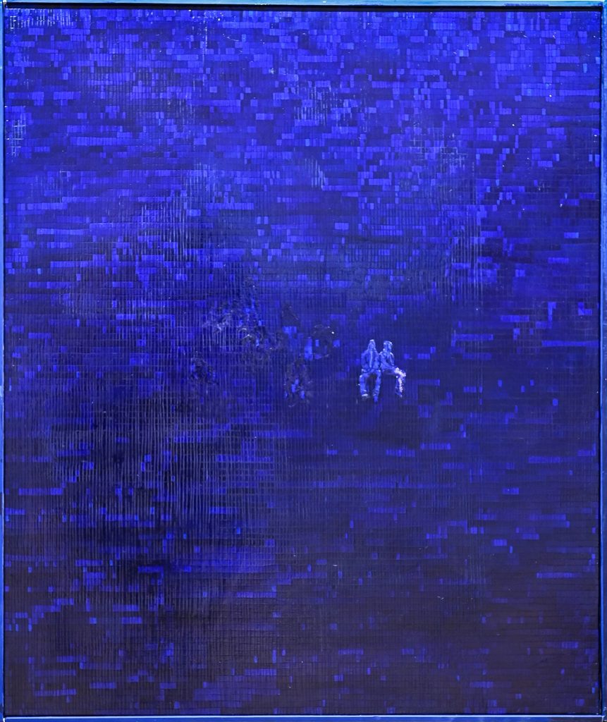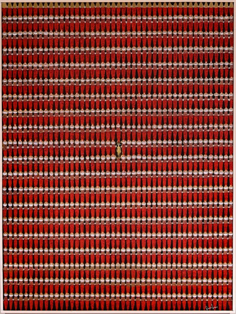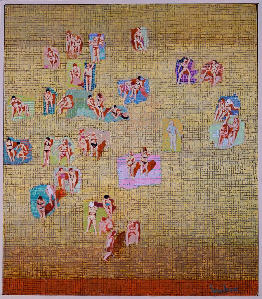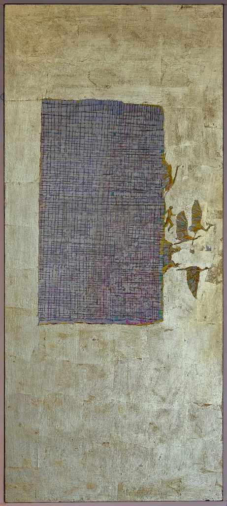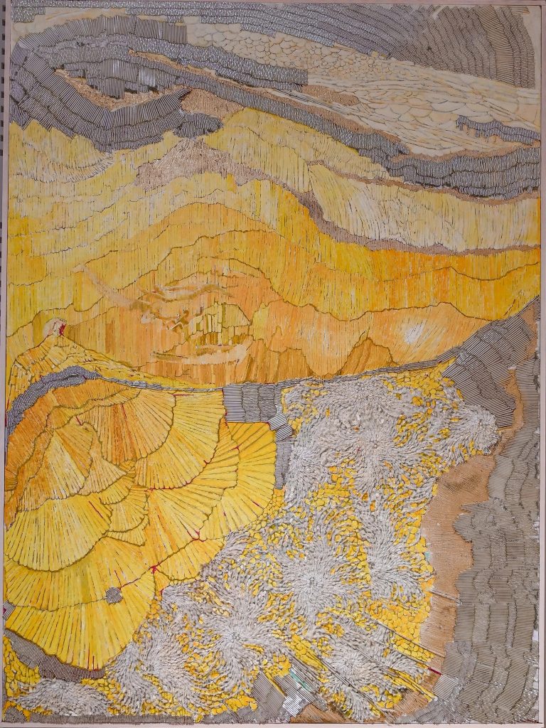 Gravure, perles de verre, dentelle, feuilles de cuivre et peinture à huile